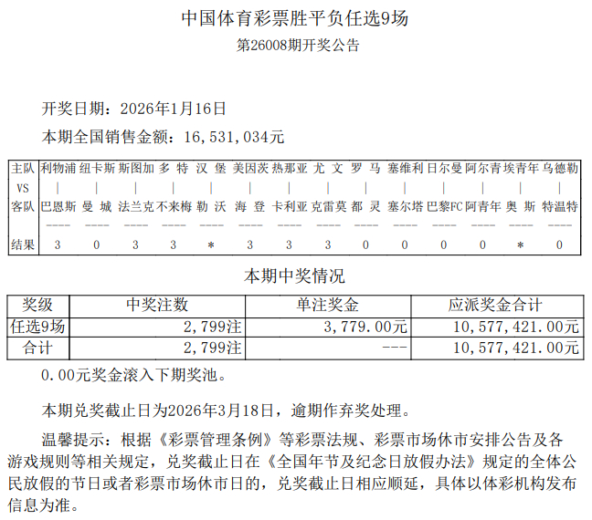 任九开奖北京时间1月16日,胜负彩第26008期任九开奖结果揭晓。期任本期任九共开出2799注,开奖单注奖金3779元。共注本期任九投注总额为16,单注531,034元。